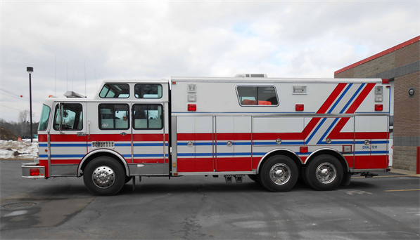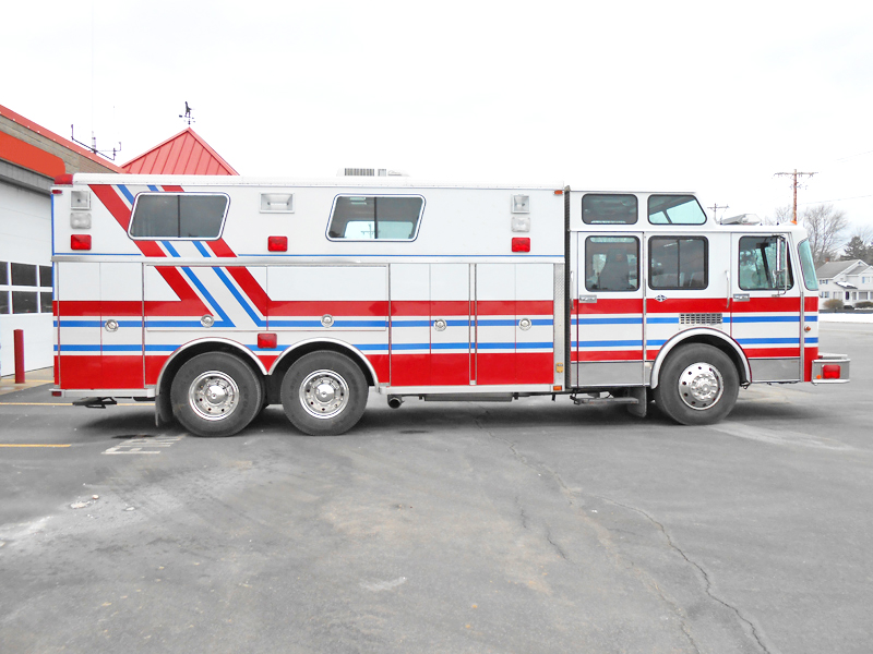 This truck has served as a heavy rescue and command vehicle, offers plenty of space for equipment and personnel. It can function as an ems triage vehicle or warming cooling station.