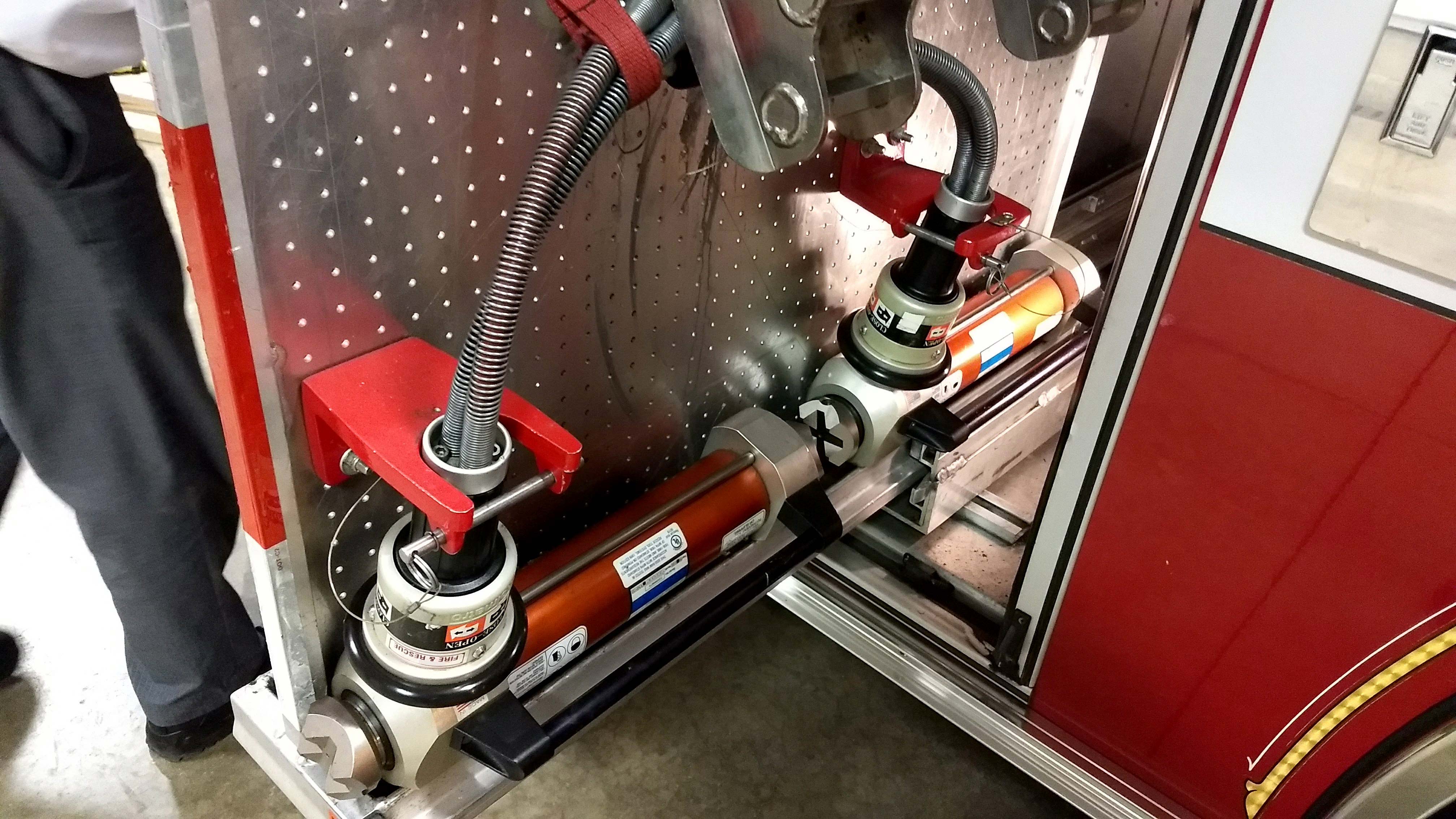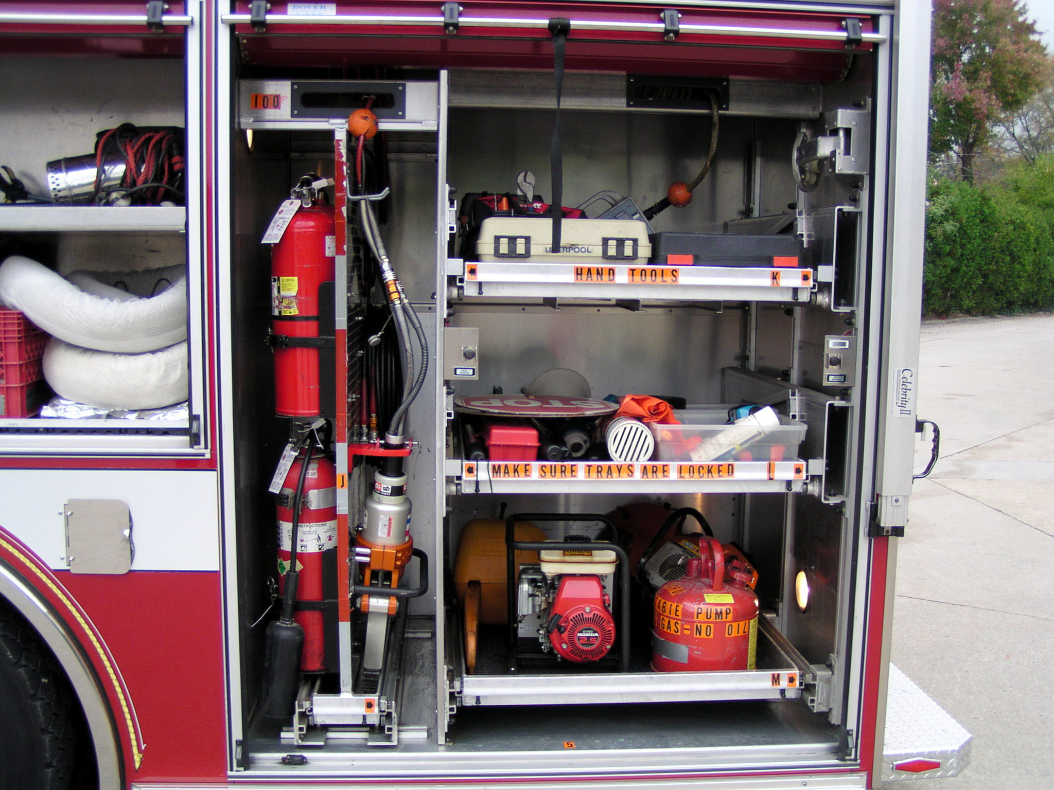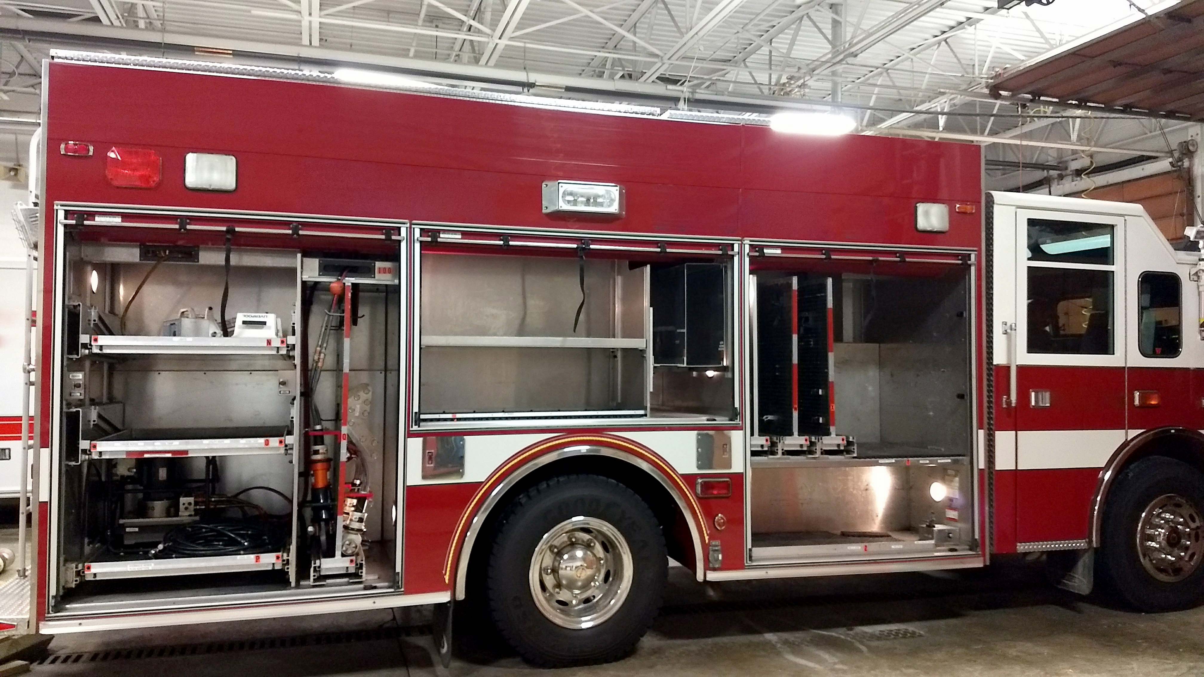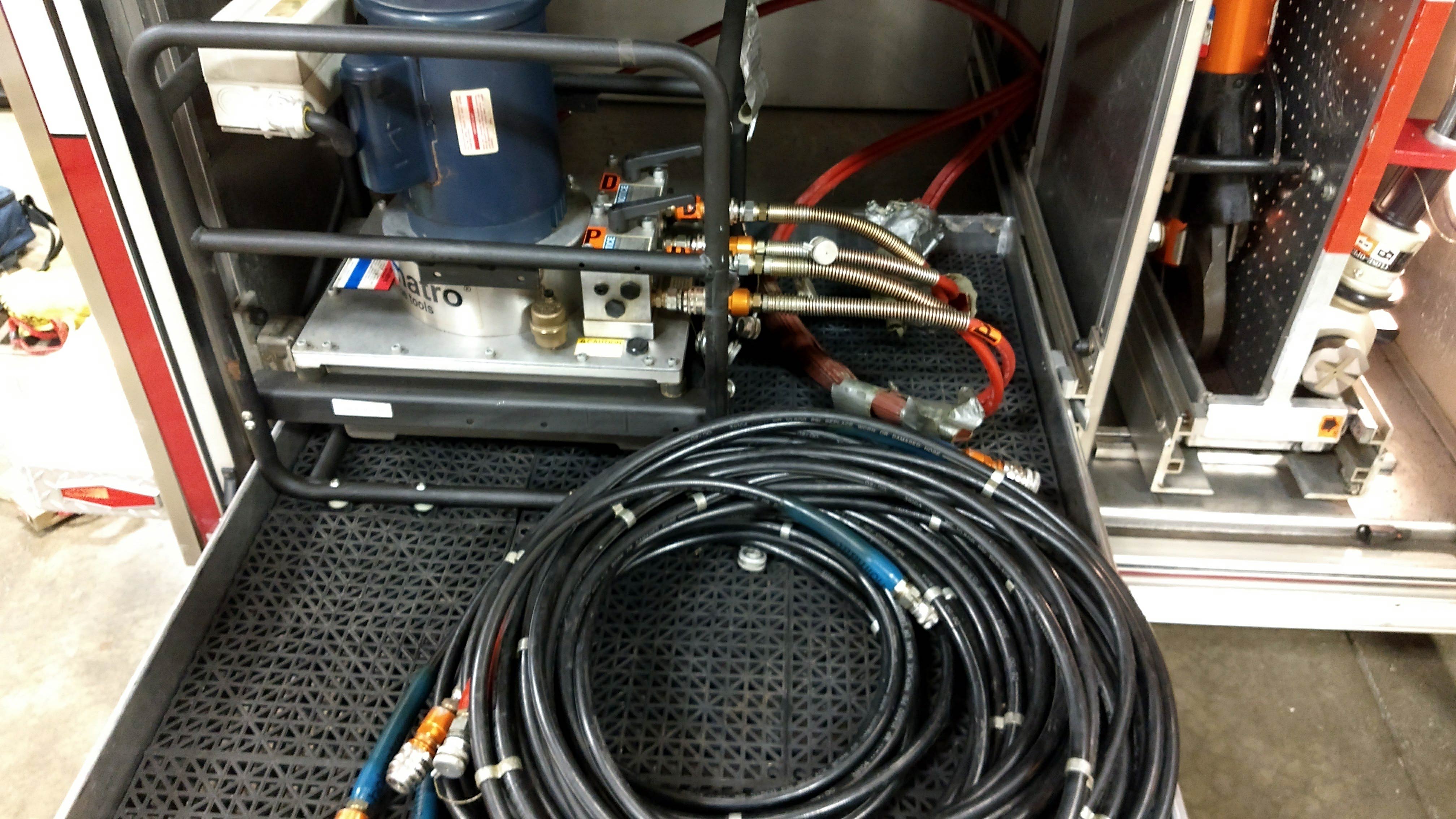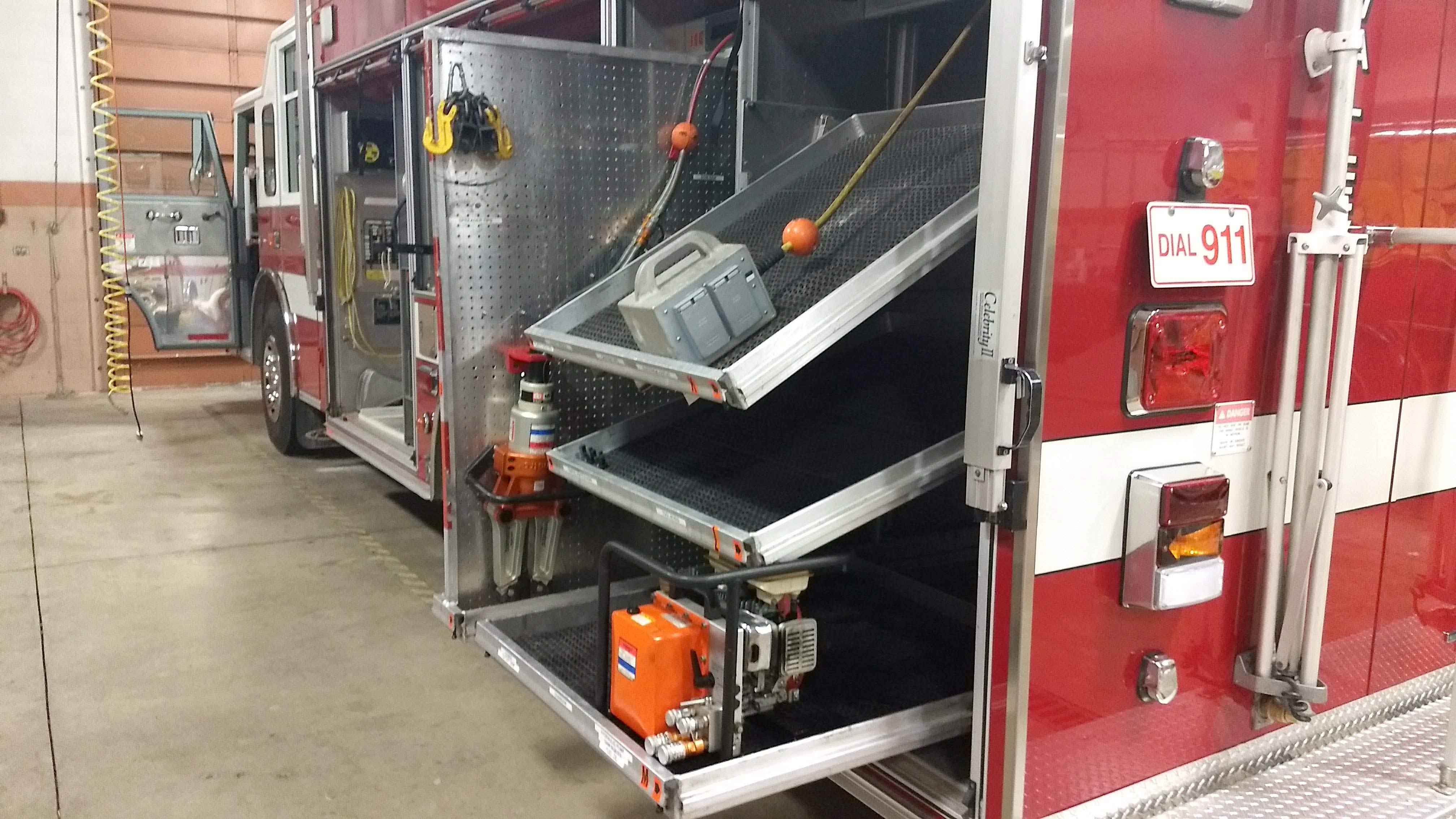 Top compartments Tool boards Shelves Slide-out tilt down trays Front hydraulic tool plumbing Side scene lights Air bags slots Air cylinder compartments (2) Tripod lights (4) Portable lights Holmatro Equipment Included:      Electric pump      Portable gasoline pump      (2) Rams      (1) Spreader      (1) Cutter