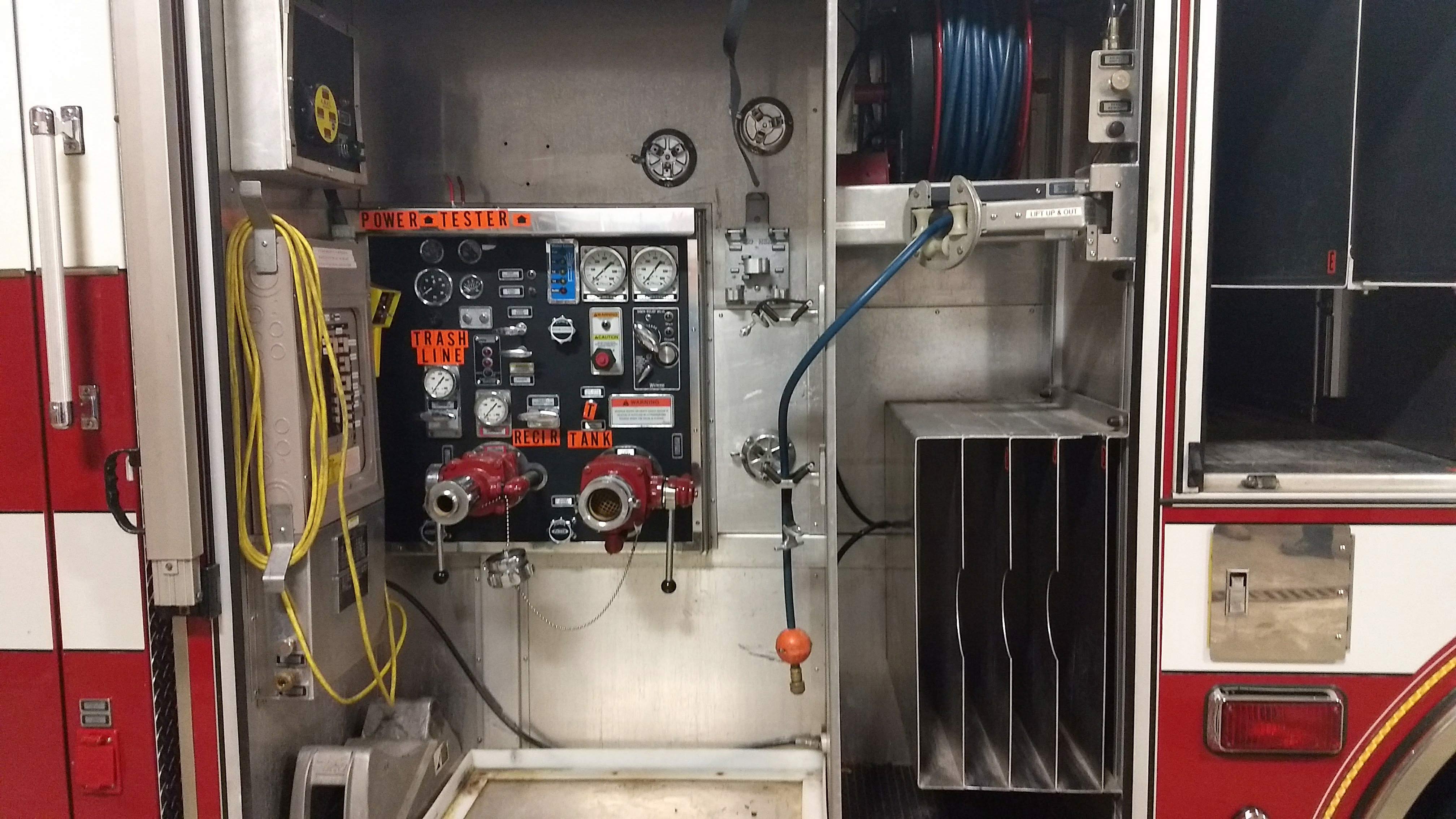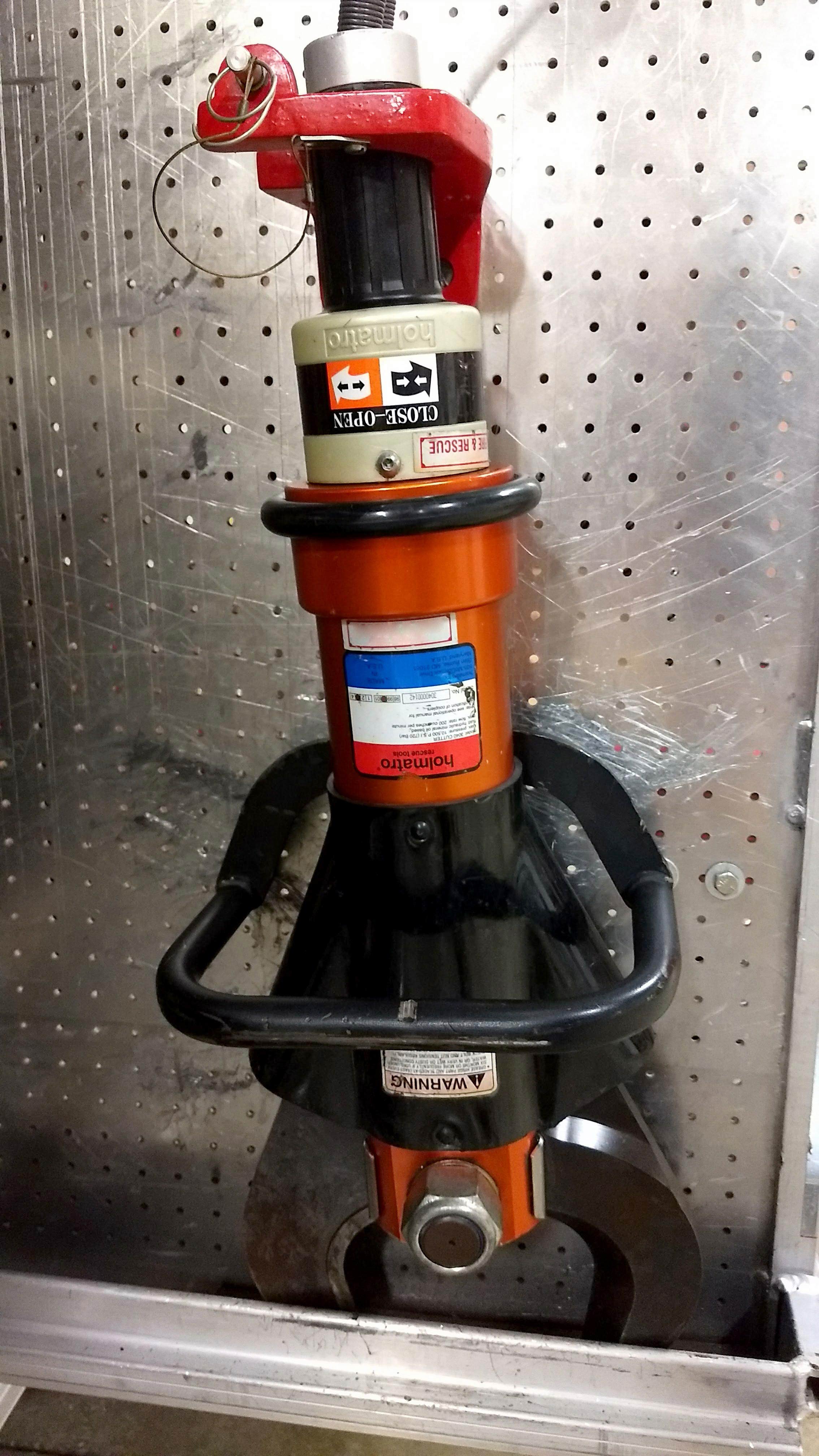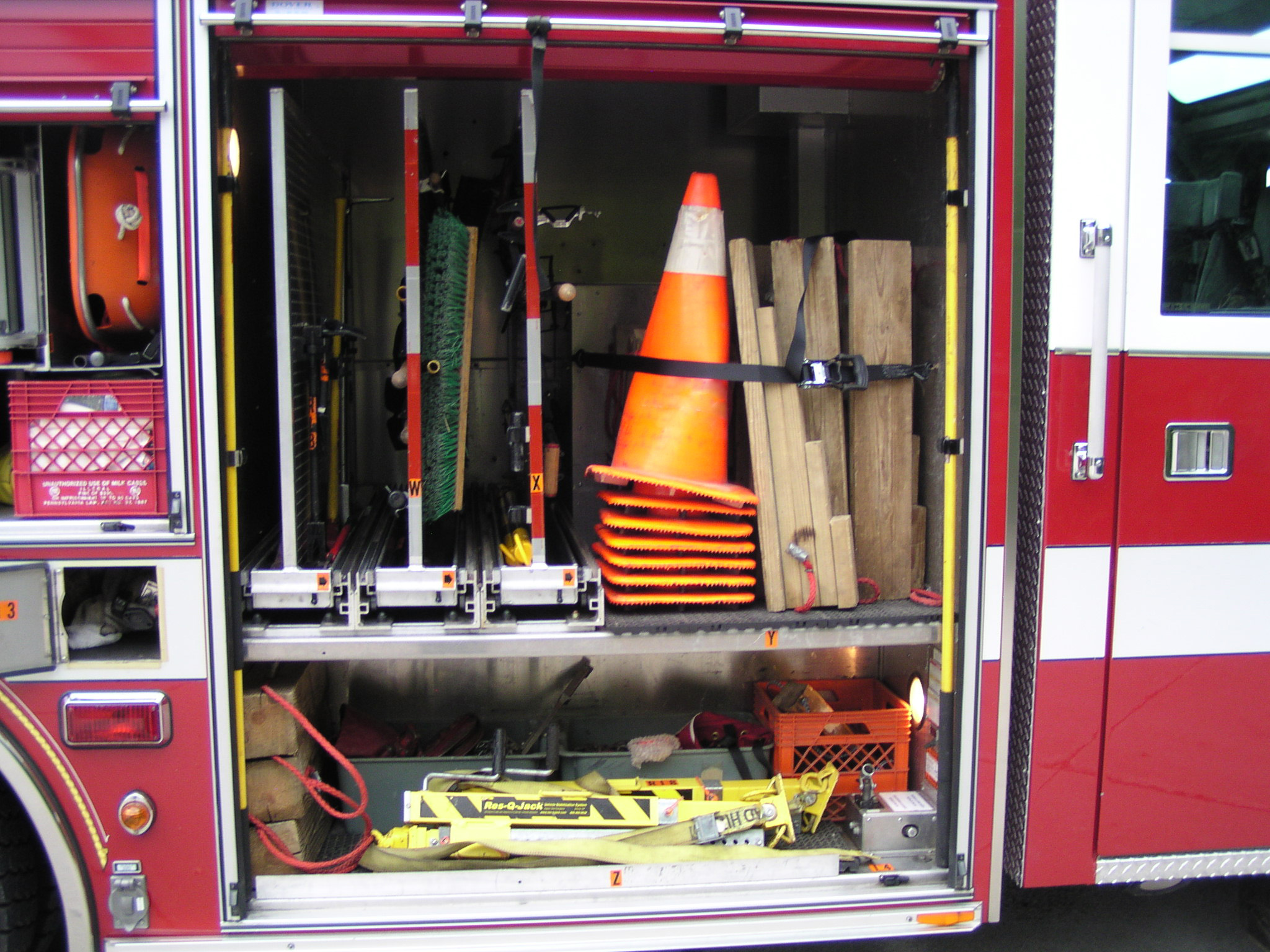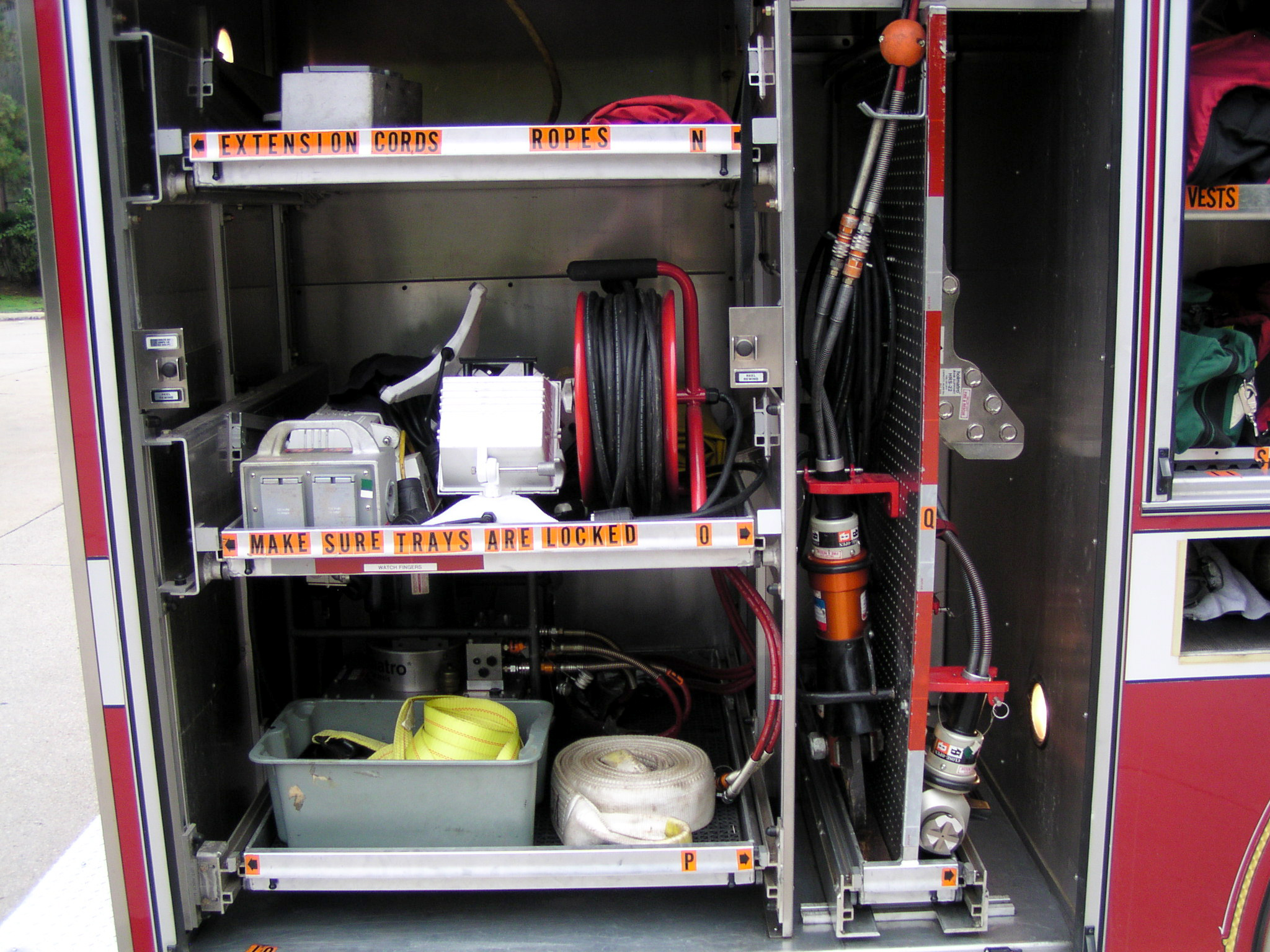Top compartments Tool boards Shelves Slide-out tilt down trays Front hydraulic tool plumbing Side scene lights Air bags slots Air cylinder compartments (2) Tripod lights (4) Portable lights Holmatro Equipment Included:      Electric pump      Portable gasoline pump      (2) Rams      (1) Spreader      (1) Cutter