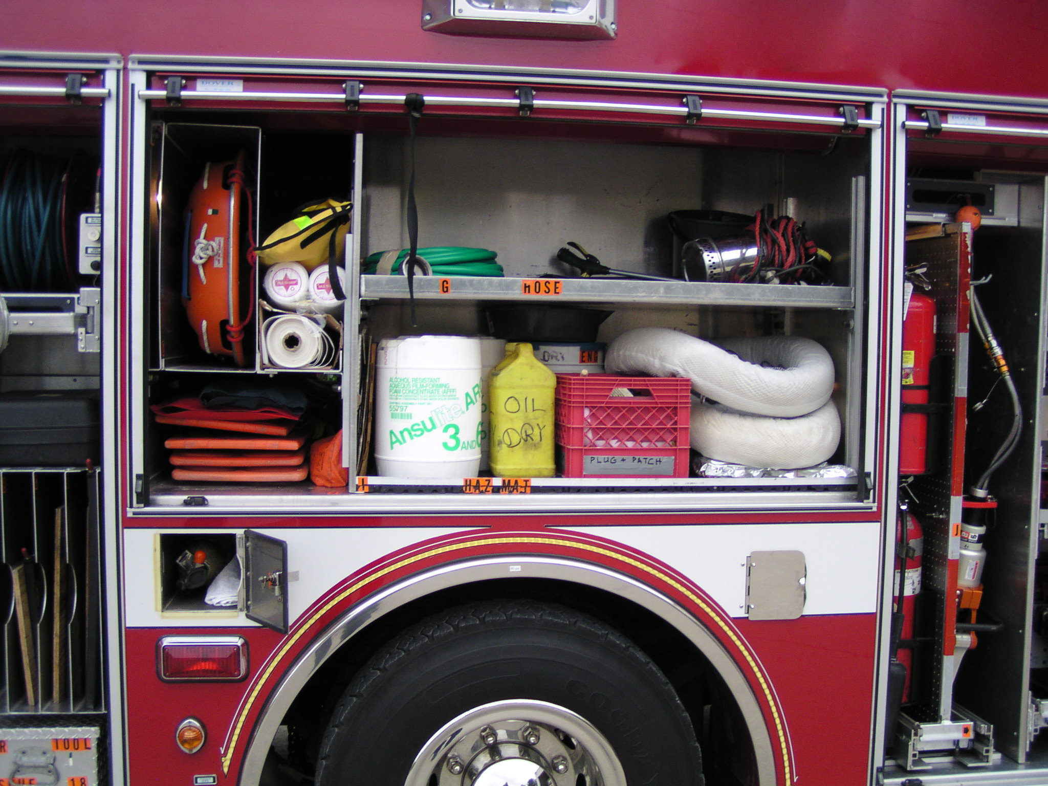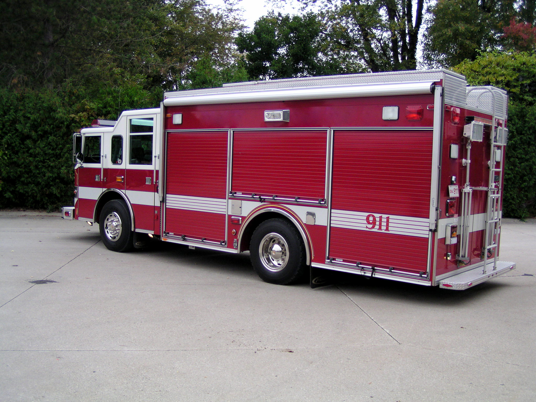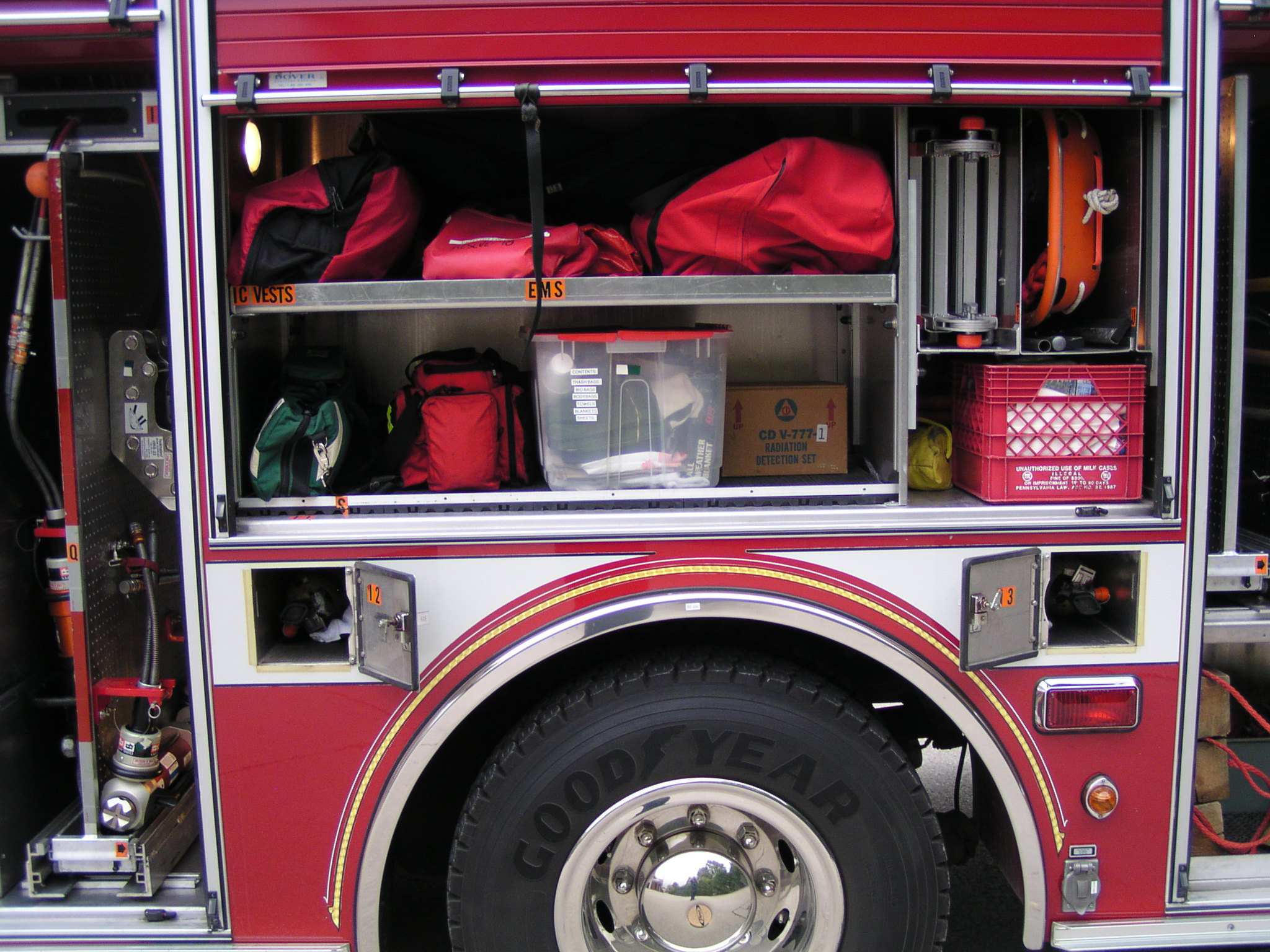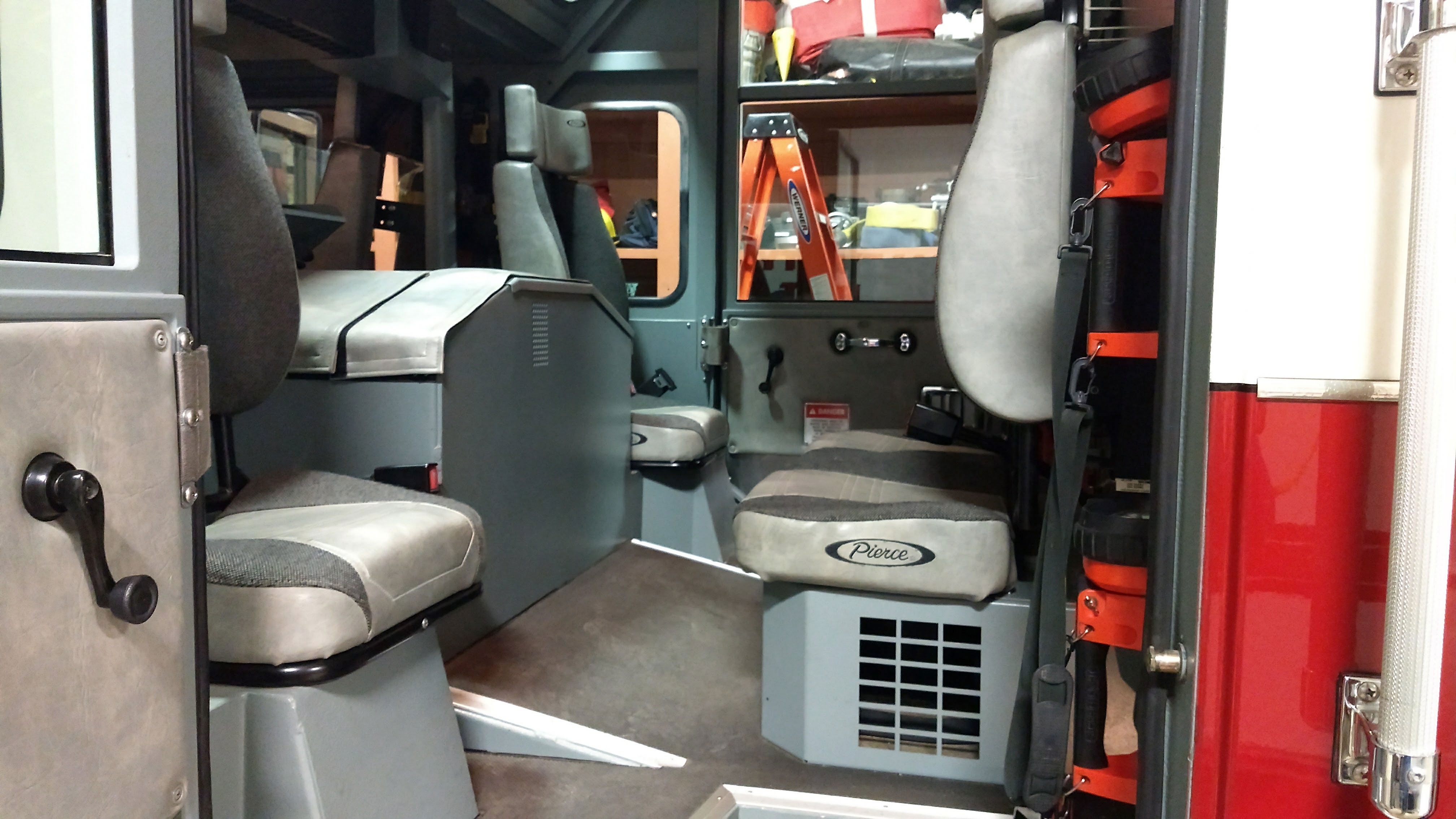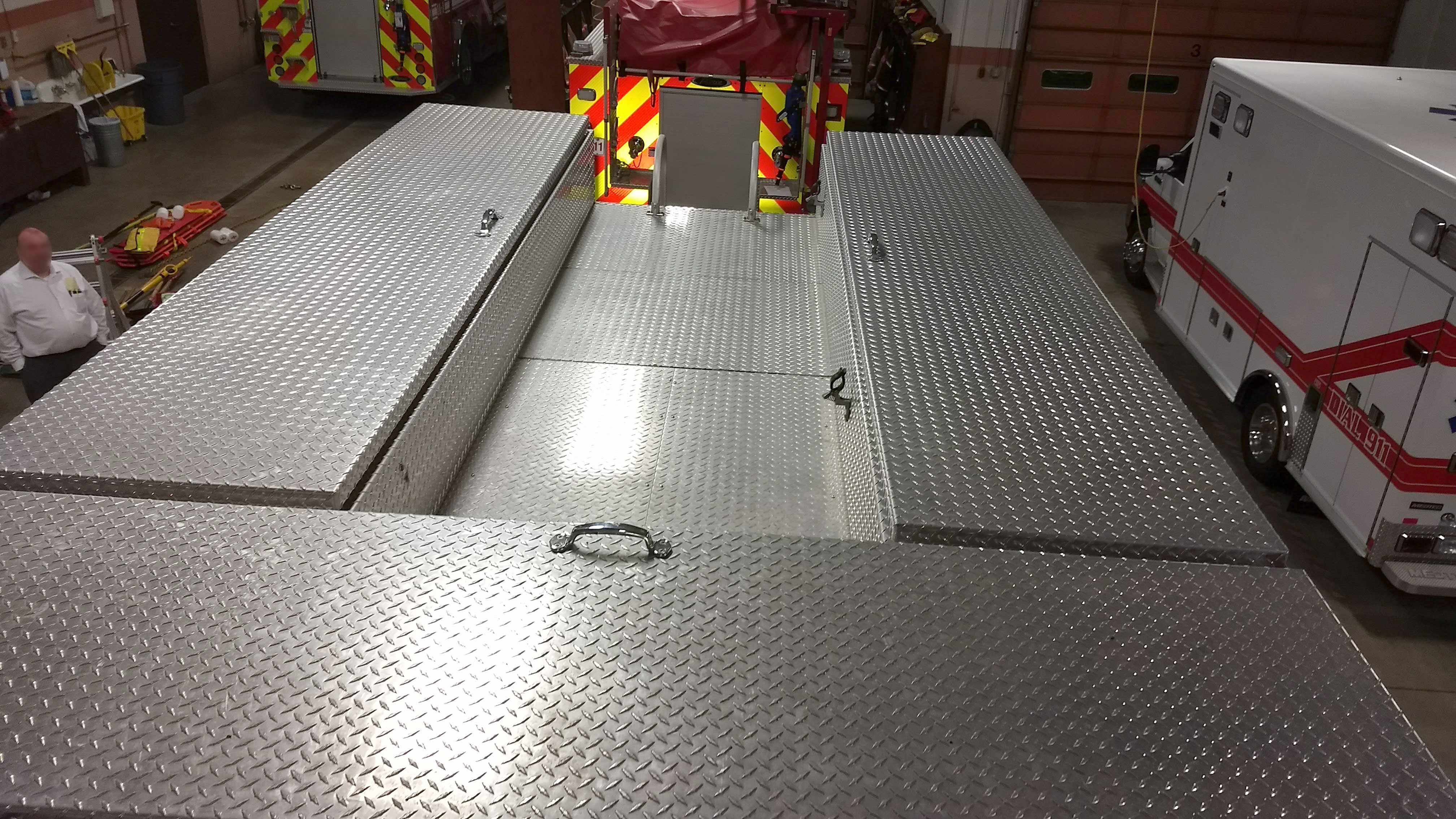Top compartments Tool boards Shelves Slide-out tilt down trays Front hydraulic tool plumbing Side scene lights Air bags slots Air cylinder compartments (2) Tripod lights (4) Portable lights Holmatro Equipment Included:      Electric pump      Portable gasoline pump      (2) Rams      (1) Spreader      (1) Cutter
